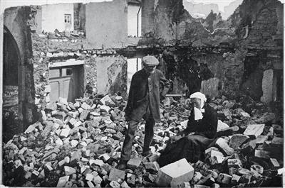 第一次世界大战因帝国主义列强分赃不均引发,给普通民众带来巨大痛苦。图为一战期间,法国一对老夫妻在被炸成一片废墟的家中哭泣 视觉中国/供图