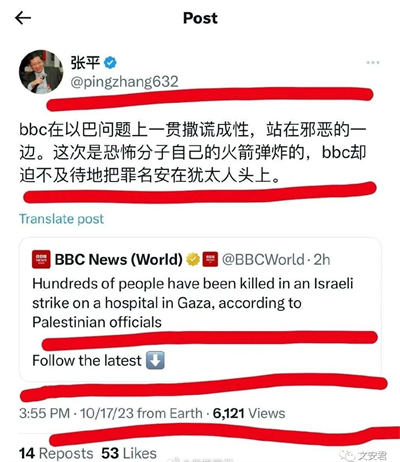 比如张平教授骂BBC,替以色列轰炸加沙地带医院的行为洗地。