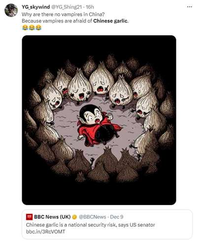 如果中国大蒜真能威胁到美国的安全,那只能说明一个问题,美国这个国家其实是一个吸血鬼假扮的。
