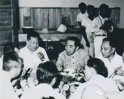 (周恩来和习仲勋1958年在十三陵水库工地上与参加劳动者一起吃午饭。)