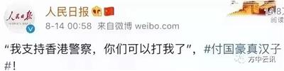 2019年8月13日晚,记者付国豪在香港遭暴徒非法拘禁与殴打,8月14日凌晨人民日报发表人民锐评《付国豪,真汉子!》文章,同日付国豪出院,接受记者采访时表示幸运没受致命伤,依然爱香港!
