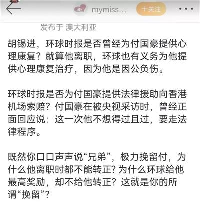 既然你(胡锡进)口口声声说“兄弟”,极力挽留付,为什么他离职时都不能转正?为什么环球给他最高奖励,却不给他转正?这就是你的所谓“挽留"”?