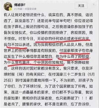 付国豪父亲还在这个帖子下面附了其他网友责问胡锡进的截屏图片,其中有一句话是: