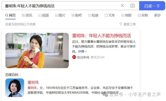 董明珠自己拿的钱,毫无疑问是吮吸的剩余价值,既然她自己拿的钱也不是他劳动挣来的地道的,实在的钱,她又有什么资格教导年轻人别挣钱呢?一个小偷当然要鼓励他人努力奋斗,别人干得多了,腰包鼓了,他才好偷,董明珠说这话,和小偷也没什么区别了。