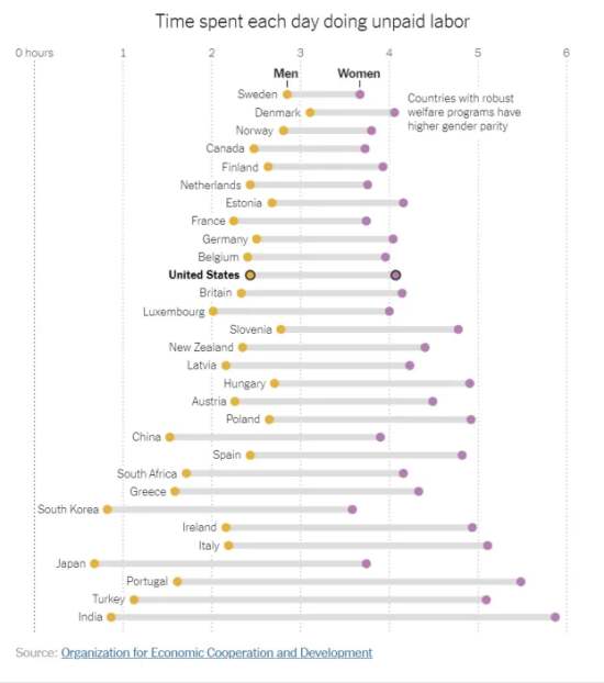 在美国,女性平均每天从事四小时的无偿工作,而男性则为两个半小时。而在1965 年,当政府首次开始记录这项指标时,美国妇女几乎承担了家庭中所有的无偿劳动。尽管无偿劳动的性别差距已经缩小,但妇女仍然承担着过多的无偿劳动,而且是在全职工作之外。