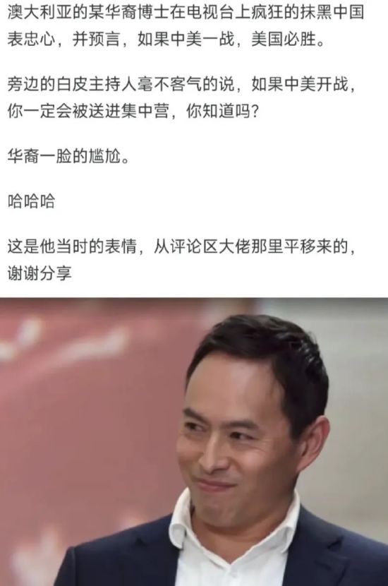 这位澳大利亚的华裔“博士” ,以及那个加入美军对中国喊话的华裔女兵郑浩儿,都是一路人。还有那个美国华裔政客杨安泽,曾在竞选总统候选人时表示,“自己对亚裔身份感到羞耻,亚裔应该向二战时的日裔学习,向美国社会表达自己的忠诚”。