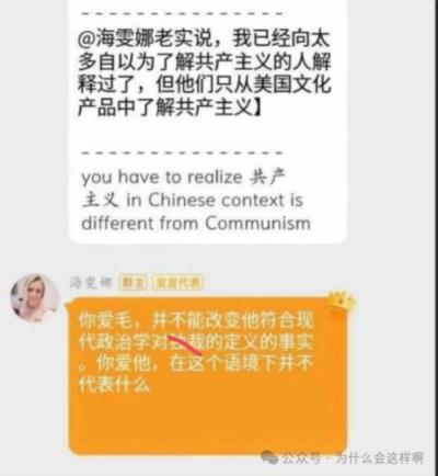 随着网友们不断地深扒,发现这个海雯娜与自己宣扬的所谓”热爱中国文化“简直大相径庭,在网友的截图中,发现这个海雯娜对于毛主席还颇有微词: