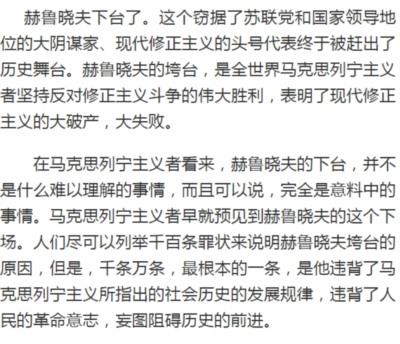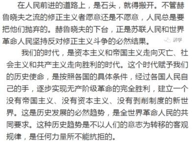 【赫鲁晓夫虽然垮了台,但是他的支持者美帝国主义、各国反动派和现代修正主义分子并没有死心。这些牛鬼蛇神仍在为赫鲁晓夫“招魂”,到处宣扬赫鲁晓夫的所谓“贡献”和“功绩”,希望事情依然按照赫鲁晓夫所规定的路线继续做下去,实行所谓“没有赫鲁晓夫的赫鲁晓夫主义”。可以断言,这条路是走不通的。】