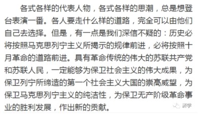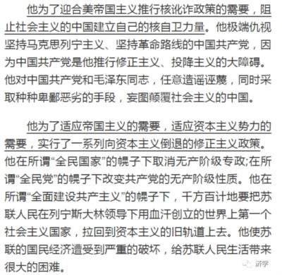 赫鲁晓夫的倒行逆施,谁喜欢?谁不喜欢?后果是怎样的?实践检验的还不清楚吗?今天俄罗斯有识之士的想法说法做法,谁还继续想不通?我们该怎样看待俄罗斯人民对毛主席的感情?毛主席为何能够那样评价斯大林?那是怎样的道器变通?