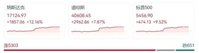 截至收盘,道指狂飙近3000点,标普500指数涨超9%,纳指涨超12%。