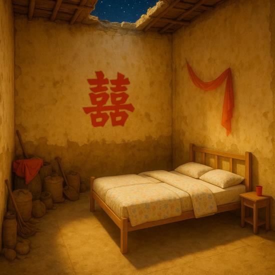 婚礼结束后,汉平母亲把我们领到了新房——幼儿院废弃的农药仓库。房间里弥漫着呛人的农药味,但我和汉平都不在乎,简单收拾一番,倒也还能住人。没想到,晚上睡觉时我们才发现,这个仓库里竟然还有个天窗,躺在床上就能看见漫天星光,简直太浪漫了!但这间婚房我们只住了两天,因为这是汉平母亲向幼儿院借的。