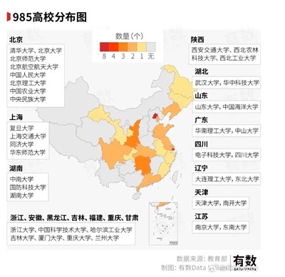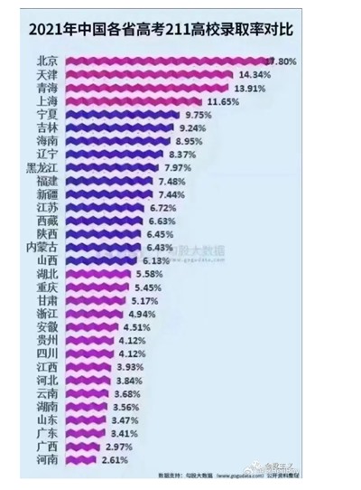 1500万人口的天津市有四所211(其中2个为985),2400万人口的上海市有十所211(其中4个为985),2300万人口的北京市有二十六所211(其中八个为985)……