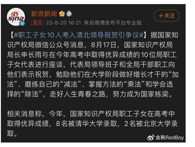 新闻①:2023年8月,国家知识产权局职工子女在高考中取得优异成绩,八名被清华大学录取,两名被北京大学录取;