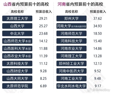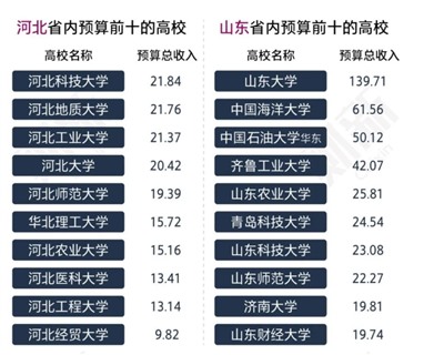 而河北、河南、山西领域内所有高校预算经费均低于四十亿元,未有任何一所高校经费跻身全国前五十。