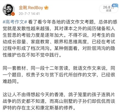 经济基础决定上层建筑,高考的分数不过是一个结果,它体现的是一个孩子背后家庭过去十八年能够给予的能量。