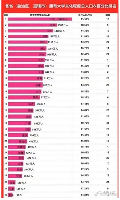作为对比,6600万人口的湖南省有四所211(其中3个为985),5600万人口的湖北省有七所211(其中2个为985),8070万人口的江苏省有十一所211(其中2个为985)。