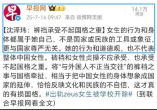 他们说,“裤裆承受不起国格之重”。首先,大连工业大学从未把李某某的“不当行为”和“有损国格”联系起来,把李某某的“不当行为”和“有所国格”画等号的是那些打着“维护”李某某旗号的媒体和自媒体;其次,从来没有人说过女人的身体不属于自己,李某某爱跟谁好就跟谁好,爱跟谁睡就跟谁睡,但李某某不只是女人,还是学生,是学生就要受到校规的约束。