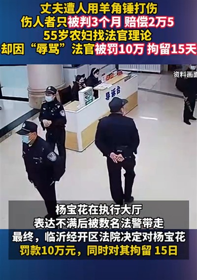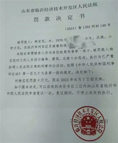 杨宝花认为法院判罚过轻,于次日上午到法院大厅找承办法官理论,被数名法警带走。当天,法院以当事人家属侮辱、谩骂法官为由,对杨宝花罚款10万元、拘留15天的决定书。6月18日,杨宝花女儿向临沂经开区法院分两次共转账10万元。次日,杨宝花结束拘留。