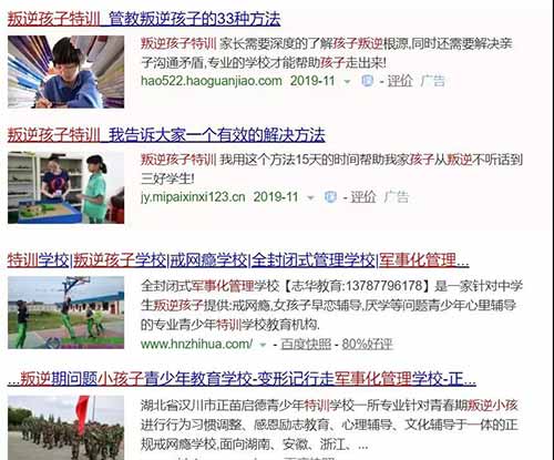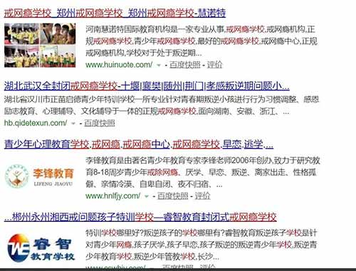 当对“网瘾”这头洪水猛兽极其焦虑的家长们想要寻找解救方法,他们打开百度搜索“如何戒网瘾”,首先映入眼帘的,是通过竞价排名出钱上位的各地“戒网瘾学校”。