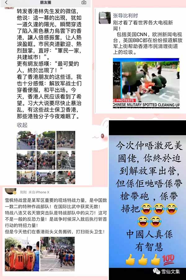 11月16日下午,驻港解放军在九龙塘以自发形式、着便装走出军营,协助清除军营附近的路障,受到香港民众热烈的鼓掌欢迎。随后港府、建制派政团及广大市民纷表赞许。香港一位退休女士在微信里说:“今看到這場面,內心如冬天一股暖流溫暖万分!”