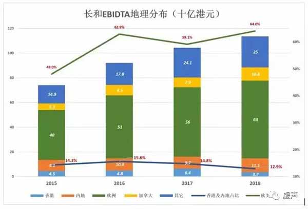 长和的EBIDTA中只有3%来自香港,10%来自大陆,两方合计12.9%;而来自欧美的利润占比达64.9%。