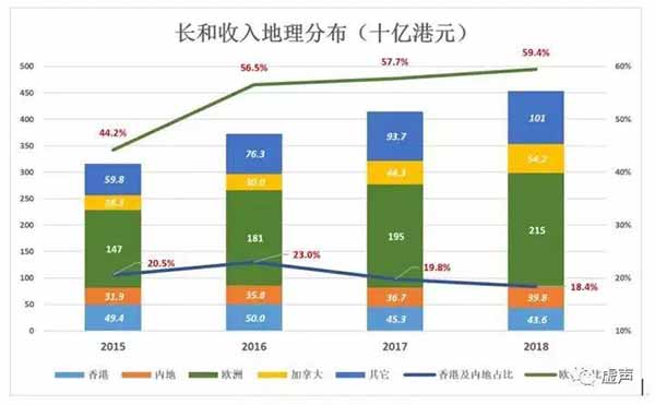 长和营收中:10%来自香港,9%来自中国内地,合计占营收的18.4%;来自欧美地区的收入占59.4%。