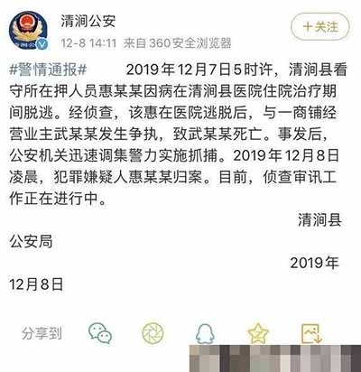 据陕西清涧警方通报,2019年12月7日5时许,该县看守所在押人员惠某某因病在清涧县医院住院治疗期间脱逃。之后,他与一商铺经营业主武某某发生争执,致武某某死亡,8日凌晨,惠某某归案。