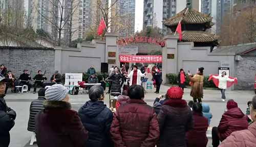 今天红光纪念馆广场的纪念活动则是由纪念馆所在社区的居民红歌会自发举办的,他们自费制作了“毛主席诞辰126周年红歌会”的横幅。一首首熟悉的红歌引来了现场驻足观看的上百群众的热烈掌声和合唱,聂晓萍老师(下图右边)也在“祝福毛主席万寿无疆”的旋律下情不自禁地跳起了舞蹈。