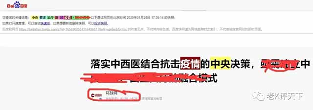 在这次会议上只是提到了要坚持中西医结合,并没有说由哪个是主次,但在1月28日环球网发表了一篇文章,不过这篇文章已经删掉了,在我看来可能是因为观点过于倾向性,作为一家官媒,出于政治因素的考量,后来就给删掉了,不过各位可以用百度快照依然可以看到这篇文章。