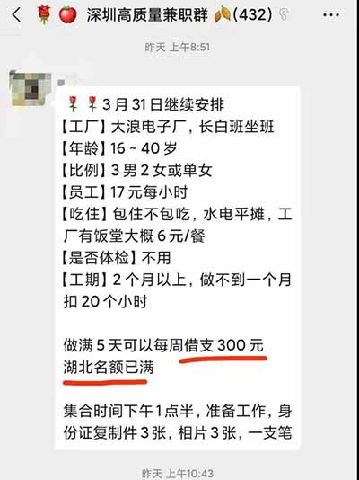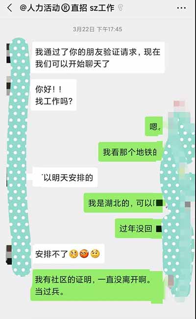 然而即使在如此缺人的情况下,中小工厂对待湖北籍工人的态度却出奇一致:拒接、勿扰、湖北名额已满,没有任何商量的余地。以深圳为例,只有少数日结零工和不需要坐班的工作会招收春节期间留深的湖北籍工人,这对数量庞大的湖北籍返岗务工人数来说是杯水车薪。