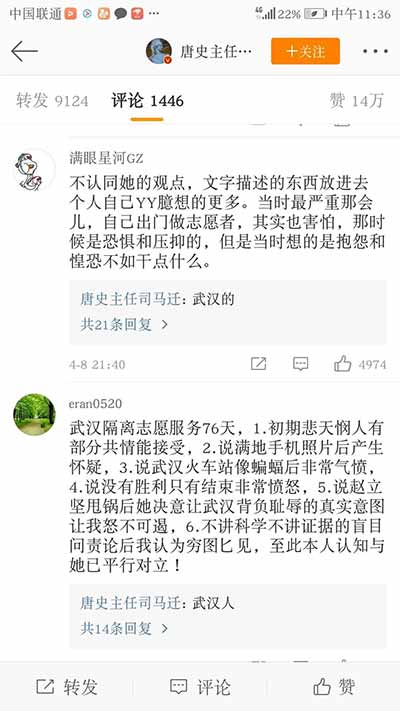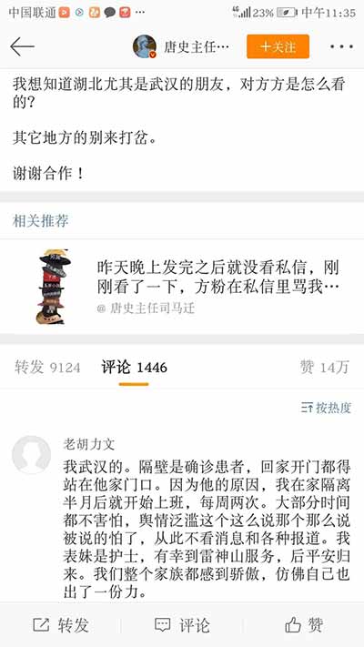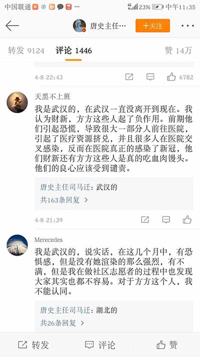 现在,武汉人对方方日记的看法,终于在一个帖子下面集中了。在公开性最强的微博,这个结果最能反映真实的武汉声音。