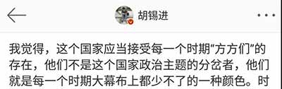 环球的胡总编曾在3月19日出来为方方解围,称“方方们”是大幕上“少不了的一种颜色”: