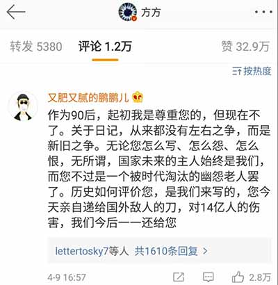 更加令笔者欣慰的是,在方方今天那条微博下面,连她曾经的90后粉丝都要出来反对她: