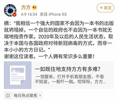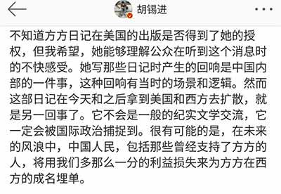 而就在昨晚胡总编不得不出来表态说:“在未来的风浪中,中国人民,包括那些曾经支持了方方的人,将用我们多那么一分的利益损失来为方方在西方的成名埋单”。