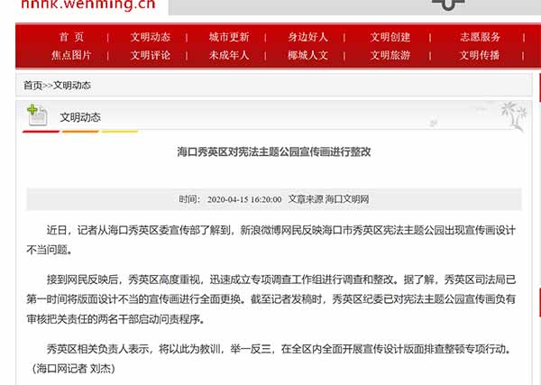 前天,一些自媒体报道了海南省海口市秀英区司法局制作的宪法主题公园宣传画把天安门城楼上的毛主席画像全部用白云遮挡抹去,这些宣传画在宪法主题公园摆放出来后被一位公民拍摄成小视频发到网上,受到网民关注,纷纷对海南省海口市秀英区司法局提出批评意见。昨天,又有自媒体给海口点赞,说从官宣获知海口市秀英区司法局已迅速改正,并问责两名干部。今天,我查到这个海口网的正式消息,内容如下: