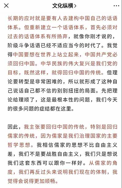 可见,如果让姚洋来决策,他即便看到了“新型冷战还是来了”,也没决心、没胆量跟美国打这场“冷战”,而是希望以儒家思想“化干戈为玉帛”,寻求美国谅解,这不得不让笔者想起了儒家思想复兴的大宋时期“割地求和”的场景。