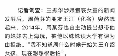 从报道细节可以得知,周燕芬至少从2014年,就开始为王振华输送女性“猎物”了,保守估计,至今已达六年时间。