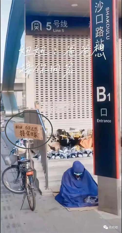 一名父亲穿着雨衣坐(跪)在地铁5号线沙口路站B1出口,低垂着头,看不清他是在回忆,还是在哭泣。