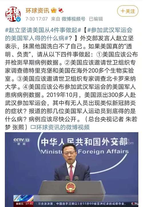 除此之外赵立坚还提出了4件事,请美国做到:第一,公布并检测早期病例数据。2019年7月弗吉尼亚州发生不明原因呼吸系统疾病,威斯康星州暴发大规模“电子烟疾病”,靠近德堡的两家养老院出现不明原因导致肺炎的呼吸道疾病。2019年9月,马里兰州报告称“电子烟疾病”患者病例数增加了一倍。美国疾病控制与预防中心主任去年曾公开承认,一些被误以为死于流感的美国人在死后诊断中被检测出新冠病毒呈阳性。