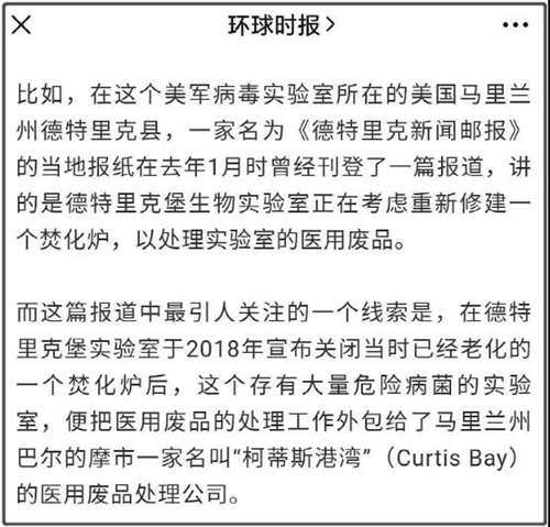 再比如,美国一家名为《德特里克新闻邮报》的当地报纸,曾经在2020年1月刊登过一篇报道称“德特里克堡”生物实验室,正考虑重新修建一个焚化炉,以处理实验室的医用废品。
