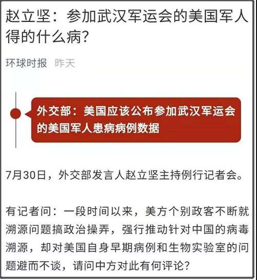 我们发言人在昨天的记者会上,是明确针对美国2019年10月派出300多人参加武汉军运会的事情,进行质疑。