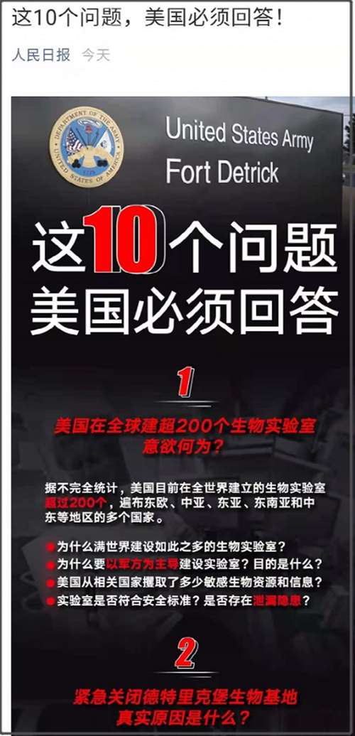 人民日报在今天连续发了两篇文章海报,还对美国德特里克堡进行质问。