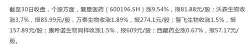 我们来看这组数据,熟悉股市的人应该清楚这意味着什么:“截至30日收盘,个股方面,复星医药(600196.SH)涨9.54%,报81.88元/股;沃森生物收涨3.7%,报85.99元/股,万泰生物收涨1.89%,报274.1元/股;智飞生物收涨1.5%,报157.89元/股;康希诺生物同样收涨1.5%,报609元/股;西藏药业涨0.67%,报57.17元/股。”