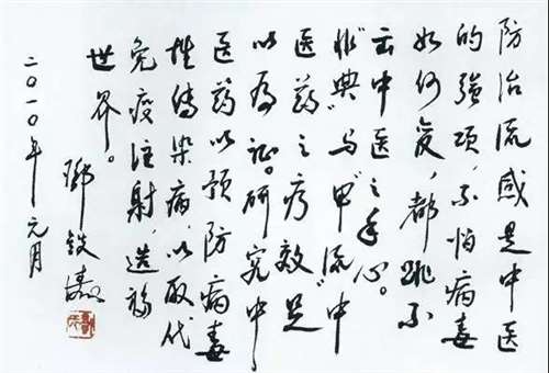 2010年元月,邓铁涛邓老写过一段话:防治流感是中医的强项,不怕病毒如何变,都跳不出中医的手心。“非 典”与“甲 流”中医药之疗效足以为证。研究中医药预防病毒性疾病,以取代免疫注射,造福世界。