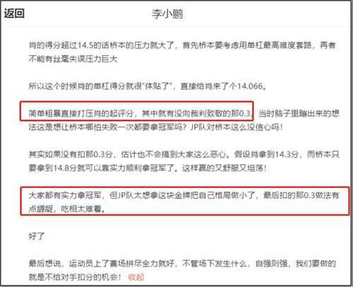 但是,我们再看看专业人士、前体操冠军李小鹏怎么说的。