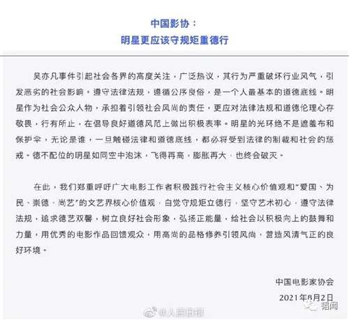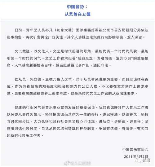 昨天,@人民日报 发帖:【#三家协会就吴亦凡事件发声#】今日,中国影协、中国音协、中国视协就吴亦凡事件发声。中国影协:德不配位的明星如同空中泡沫,飞得再高,膨胀再大,也终会破灭。中国音协:健康的行业风气是音乐事业繁荣发展的重要保证。中国视协:所谓顶级流量、粉丝后援、外籍身份都不具备为所欲为的特权,绝不是违法失德的护身符。