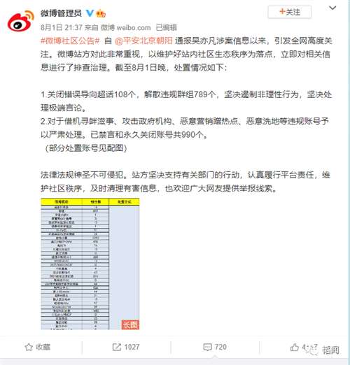 8月1日,@微博管理员 发布公告称,自 @平安北京朝阳 通报吴亦凡涉案信息以来,为维护好站内社区生态秩序,截至8月1日晚,关闭错误导向超话108个,解散违规群组789个,已禁言和永久关闭账号共990个。