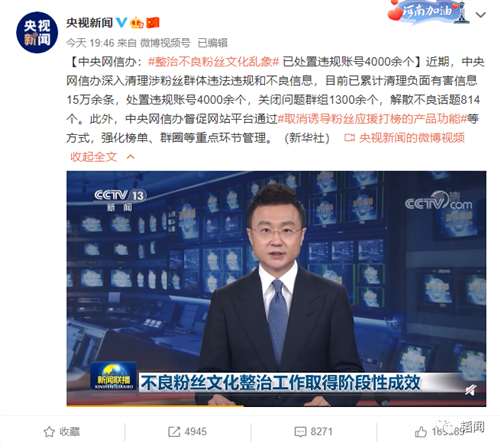 @央视新闻 的新闻联播发布新华社消息:中央网信办整治不良粉丝文化乱象,整治工作取得阶段性成效,已处置违规账户4000余个。