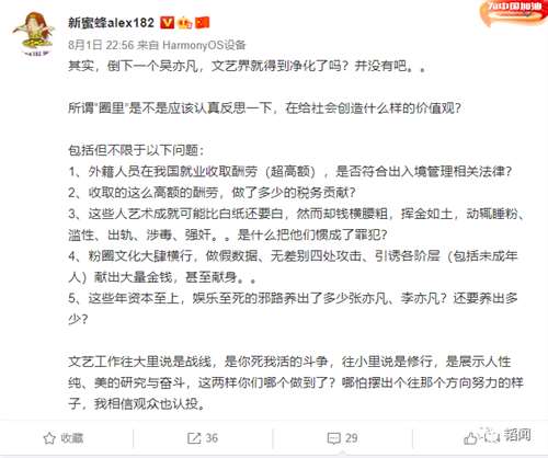 @新蜜蜂alex182 在一个帖子里指出:其实,倒下一个吴亦凡,文艺界就得到净化了吗?并没有吧。。