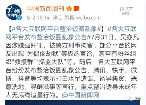 @中国新闻周刊 评论:#各大互联网平台发布整治饭圈乱象公告#7月31日,吴亦凡因涉嫌强奸罪,被警方刑事拘留。部分平台的网友出现“为偶像劫狱”等极端言论,甚至有粉丝组织“救援群”“探监大队”等。随后,各大互联网平台纷纷发布整治饭圈乱象公告,腾讯、快手、微博、抖音等均表示打击水军造谣、诱导集资、恶意洗地、寻衅滋事等言行,重点整治诱导未成年人无底线追星行为。